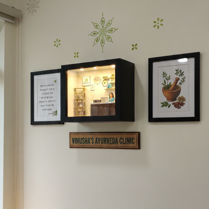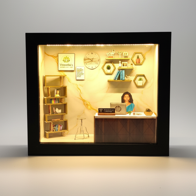 This stunning miniature setup beautifully recreates a real-life Ayurveda clinic with a doctor’s desk, bookshelf, indoor plants, and wall décor, all illuminated with soft LED lighting. Every tiny detail is crafted with love to capture the calm and natural energy of an Ayurvedic space.