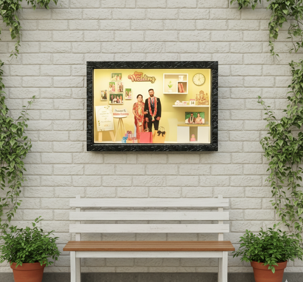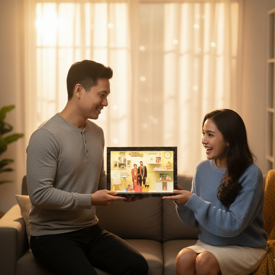 Each box is custom-designed with the coupleโs photo, wedding dรฉcor elements, and thoughtful details like garlands, gifts, and wedding signs โ making it a one-of-a-kind memento.