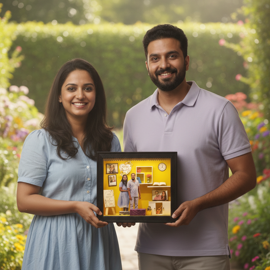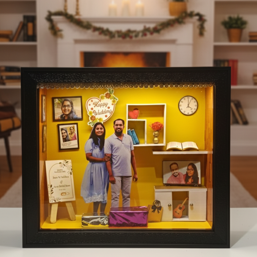 Each frame is custom-made with miniature props, vibrant lighting, and personalised photos to tell your beautiful love story in a unique, artistic way. Perfect as a wedding gift, anniversary surprise, or home dรฉcor piece, this box adds a personal touch that lasts forever.