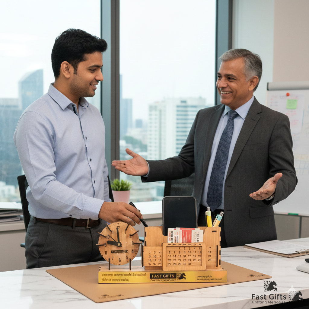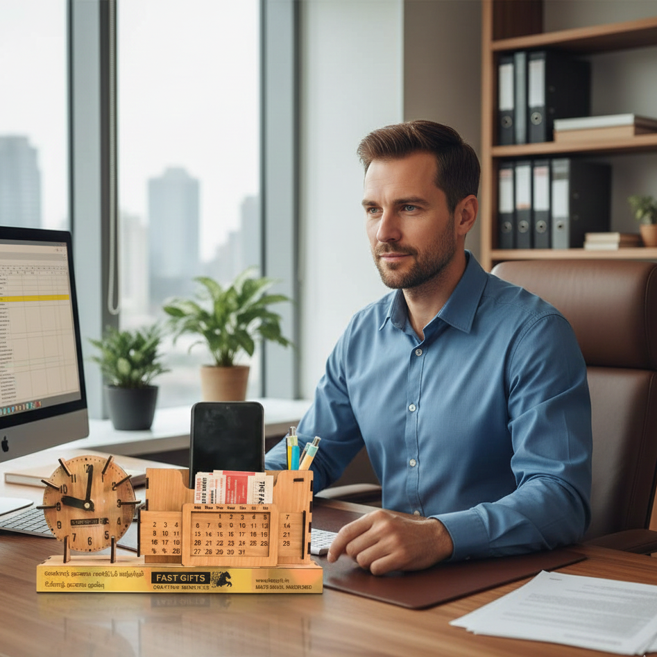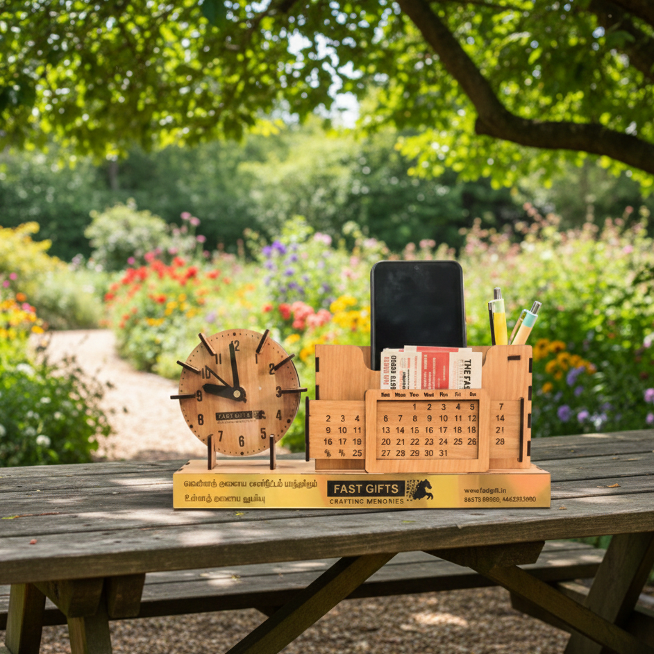 Pen stand + mobile holder + card holder + analog wooden clock + perpetual calendar in one premium unit.