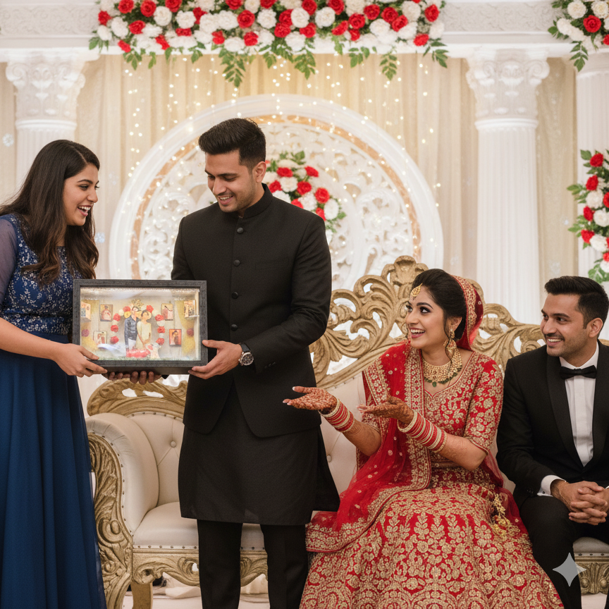 Each box is uniquely handcrafted with glowing LED lights, realistic dΓ©cor, and personalised couple cutouts that capture the emotions of your wedding day. Add your photos, names, and special date to make it a timeless keepsake that tells your love story forever.